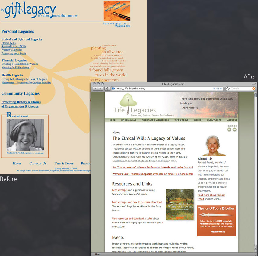 An author and national speaker needed her site to promote her books and e-newsletter. Her current site at the time rarely did either successfully. I re-designed her site and the brand, and within a year her newsletter with a few dozen subscribers grew to over 1,000.
