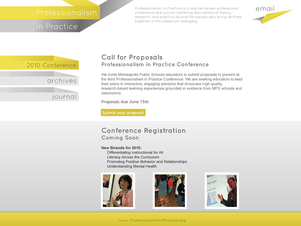 A MN professional development group for teachers needed a way to promote their new conference to subscribers to their journal, and new teachers throughout the state. On a modest budget, I designed a site and html emails that allowed them to accept proposals from speakers, and enable attendees to register and pay without any manual steps required by volunteers.